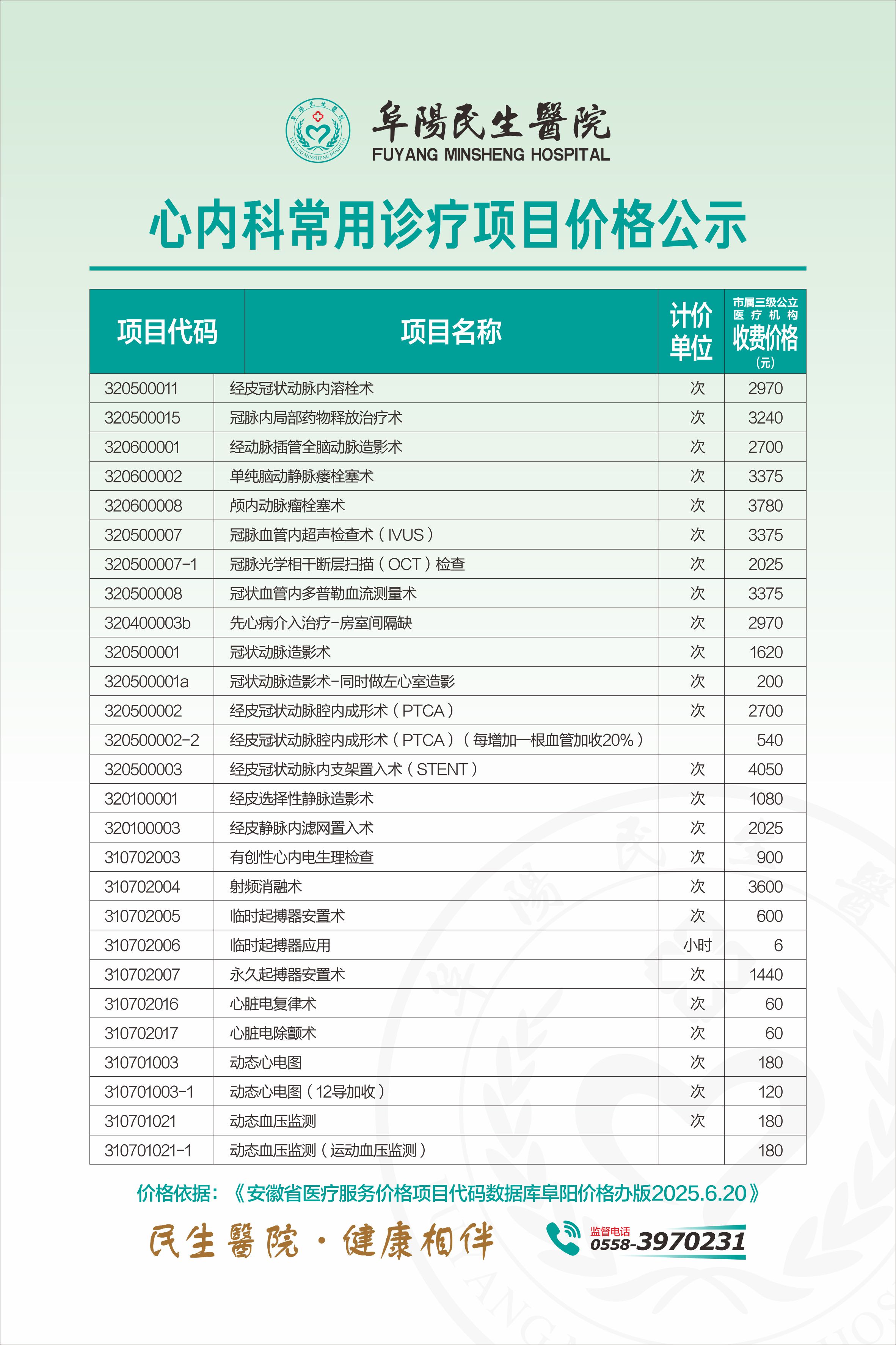心内科常用项目价格公示