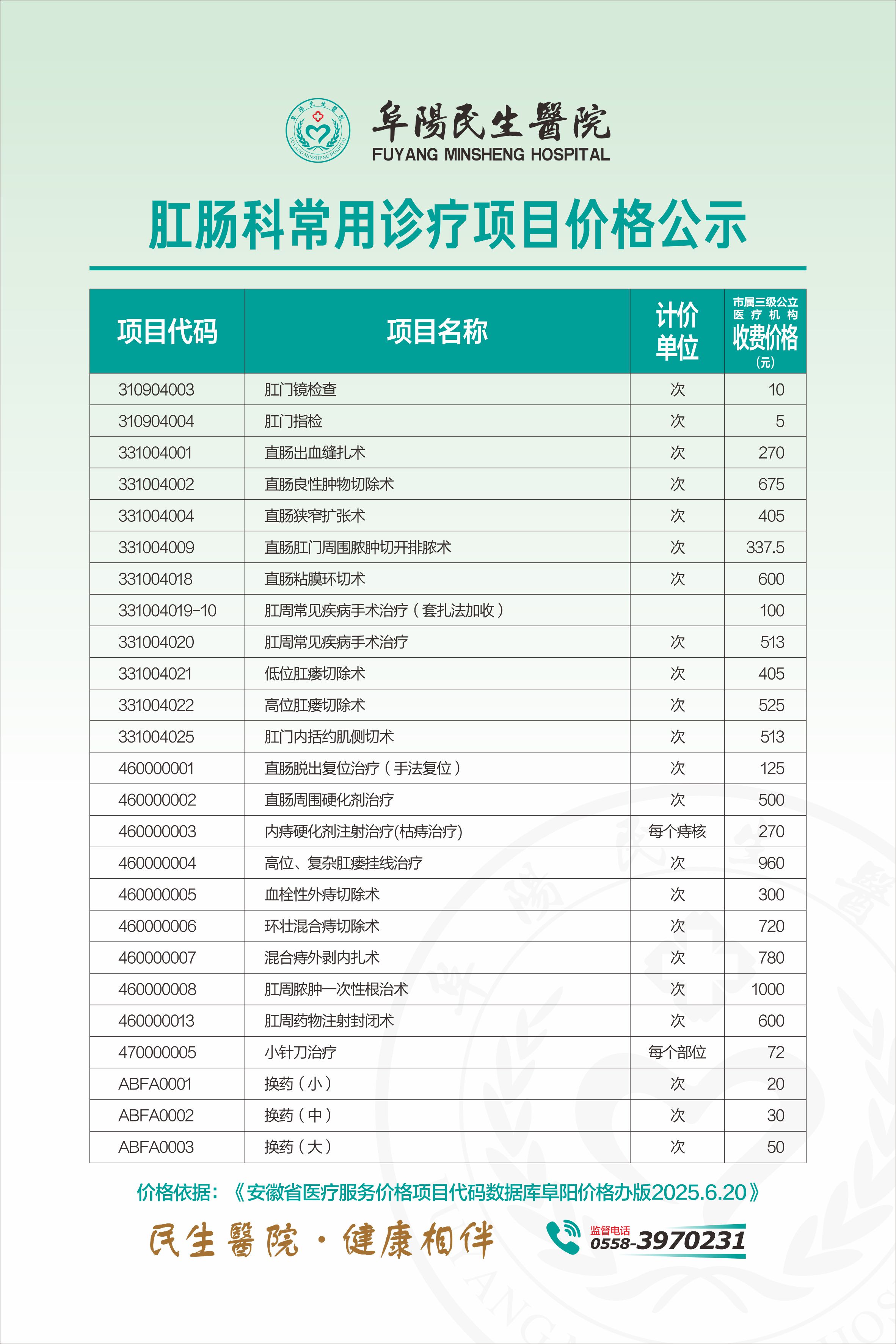肛肠科常用价格公示